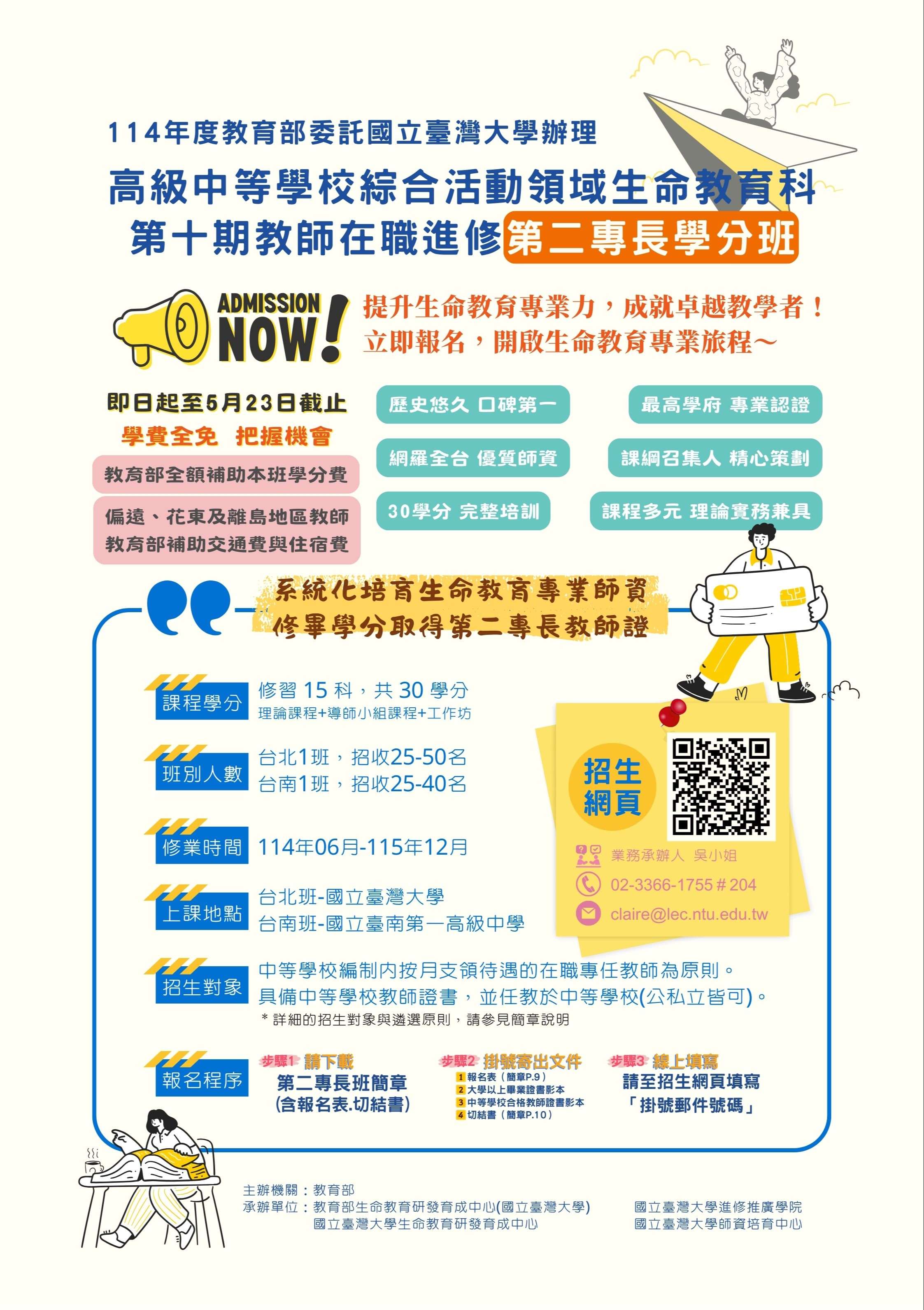 本學分班規劃開設專門課程共15科、30學分,分別於臺北 及臺南各開設1班,學費全免,偏遠、花東及離島地區另有 補助,詳細資訊請參閱招生簡章。