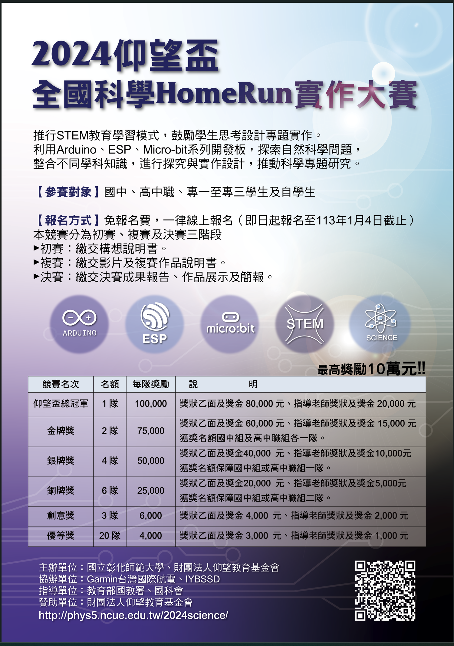旨揭活動為彰師大與「財團法人仰望教育基金會」合作推行STEM教育,利用Arduino、ESP或Micro-bit系列開發板實作設計,進行科專題探究而共同辦理,活動訂於113年5月4日(星期六),假彰師大辦理,詳細活動訊息請參閱競賽手冊。