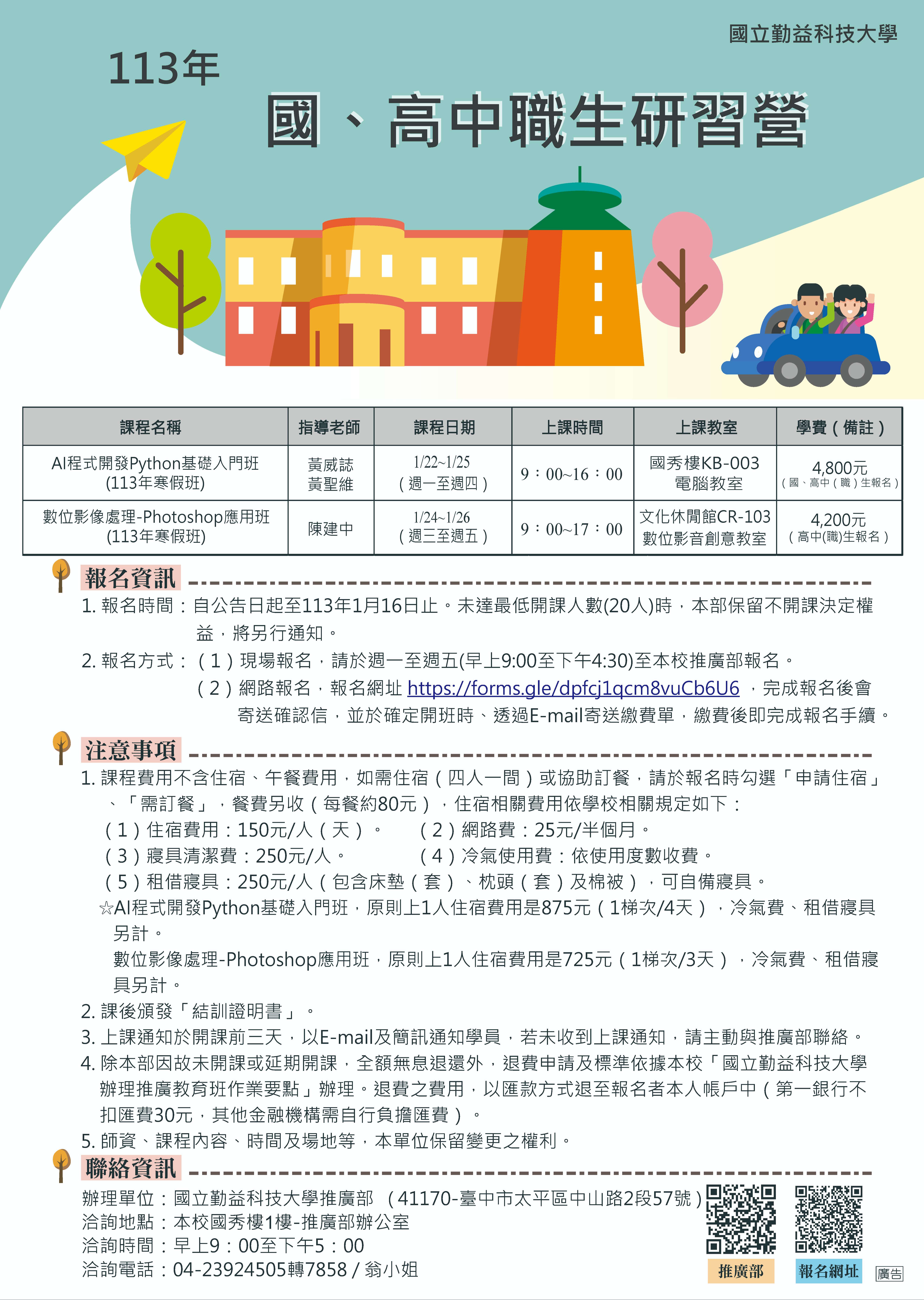 一、「AI 程式開發python 基礎入門班(113年寒假班)」課程期間:113年1月22日至113年1月25日;「數位影像處理-Photoshop應用班(113年寒假班)」課程期間:113年1月24日至113年1月26日。