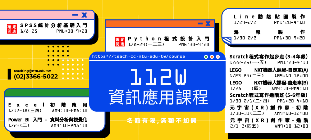 一、計算機及資訊網路中心(下稱本中心)於113年1月20日起辦理暑假資訊應用課程,課程詳細資訊與報名網址請至該中心網站查詢https://teach.cc.ntu.edu.tw