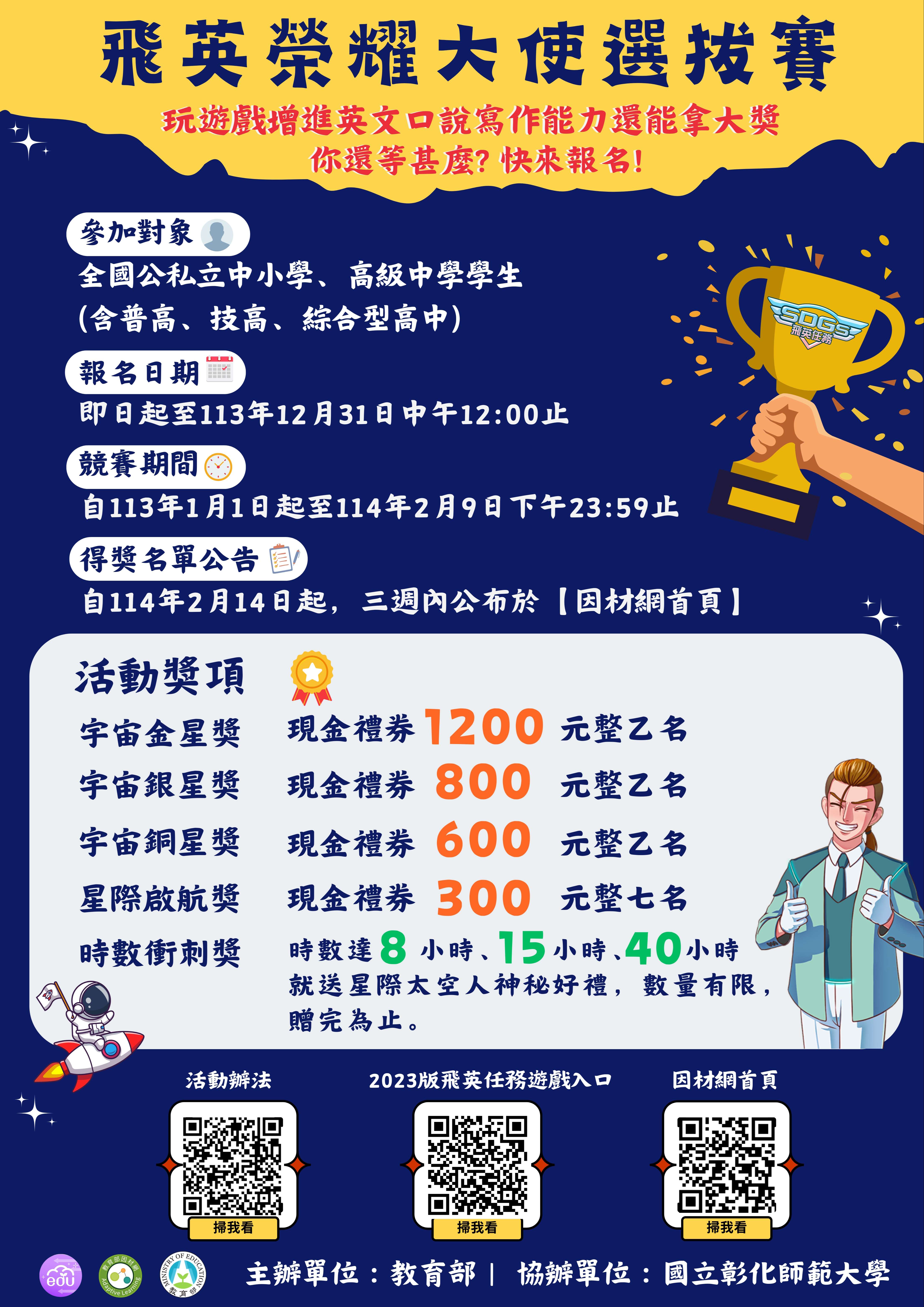 一、為提升全國中小學及高級中學學生英語口說與寫作能力,教育部『高中英語文口說及寫作遊戲開發與推廣計畫』推